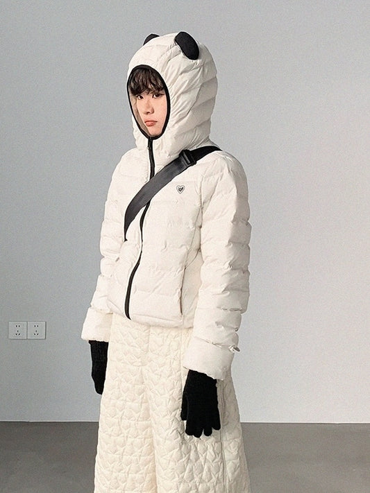 White Jacket Zipper Panda Ear with Decor Hood - Ribbed Daily Kawaii Down Front Hooded