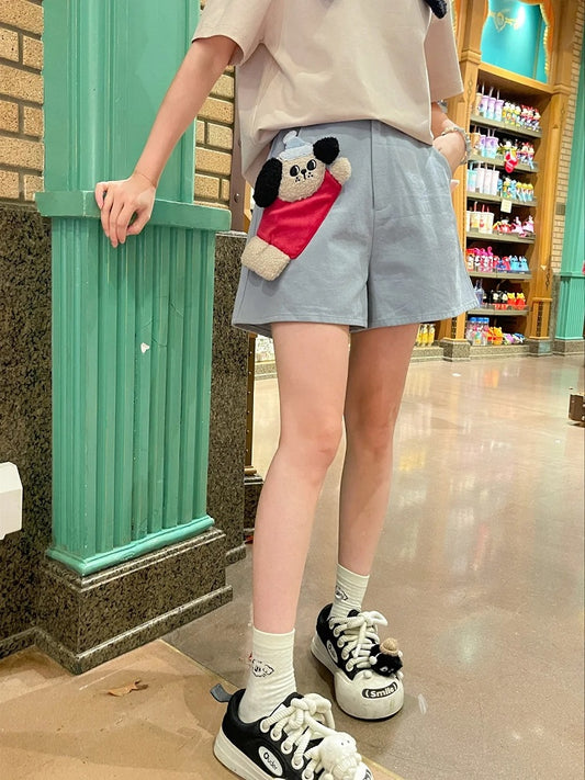 Waist Plush Puppy Applique Light Blue High Straight-leg Shorts