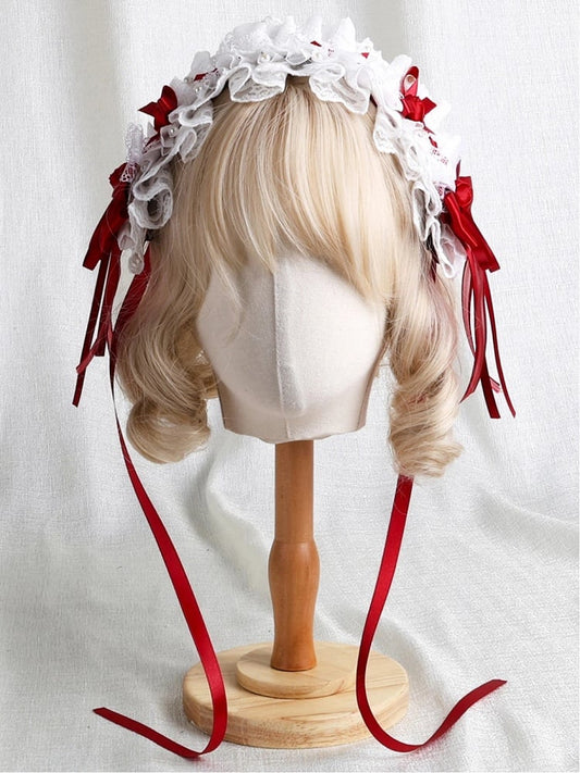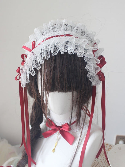 White Ribbon Lace Hairband Ruffled Red