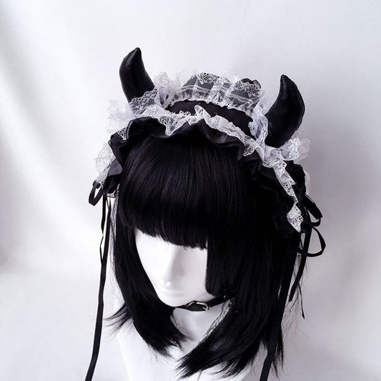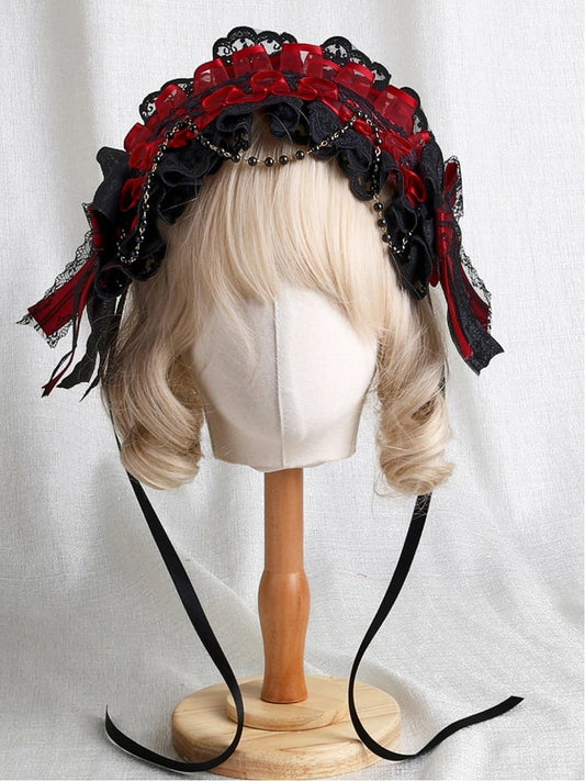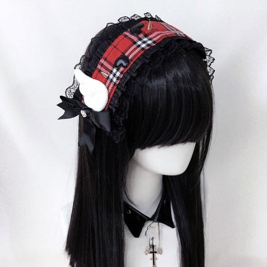 Trim Plaid Hairband Details Studs Black/Red Lace with