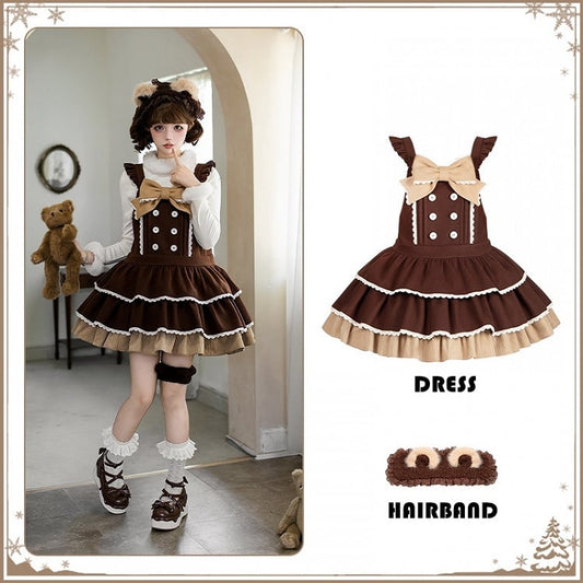 Bear Coffee Lolita Winter Tiered Sweet Overall Dress + Hairband Ear