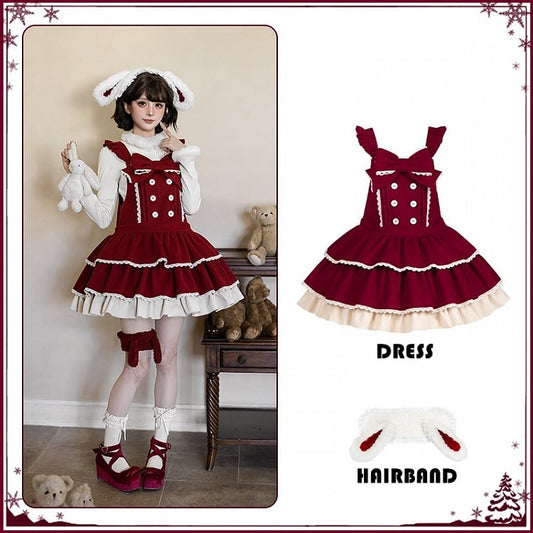 Winter Tiered Ear Sweet Bunny Hairband Dress Red Lolita Overall +