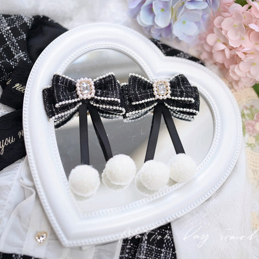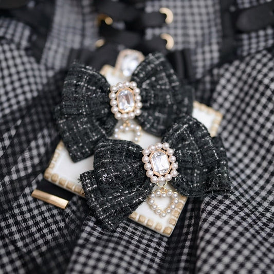 Jirai Kei White/Black Rhinestone and Beaded Heart Adorned Tweed Bowknot Hairclips