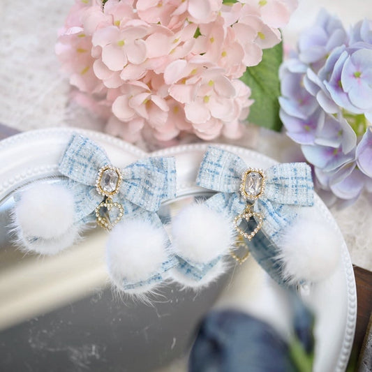 Jirai Kei Light Blue Beaded Tweed Bowknot Hairclips Pompom Details