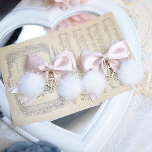 Jirai Kei Dusty Pink/Black Fluffy Pompoms Bowknot Hairclips