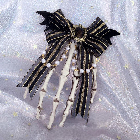 Hand Hairclip Skeleton Black with Bow Lace Bat Wings