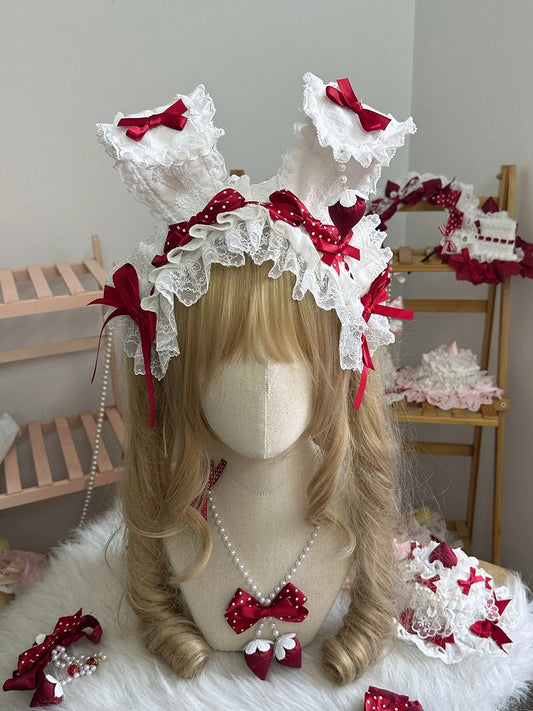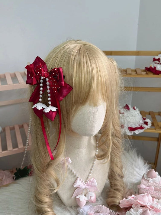 + Velvet Hairclip and Beige Bowtie Lolita OP Elegant Winter Bow Red Bell Sleeves