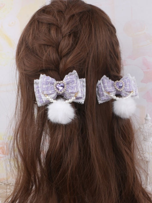 Tweed 5 Color Options With Hairclip Rhinestone Bowknot Jirai Pom-Poms Kei