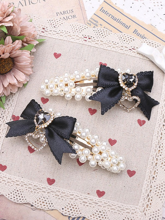 Rhinestone Heart Jirai Bowknot Kei Pearl Hairclip Black/Pink