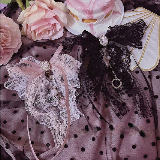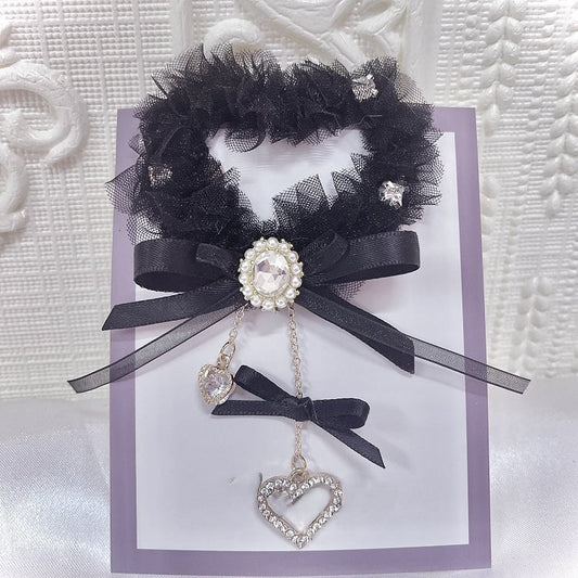 Heart Pendant Lace Bow Hairclip Rhinestone with Black/Pink