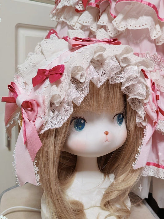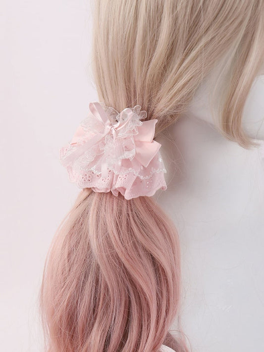 Multi-Layer Light Print Golden with and Lolita Hairclip Lace Bowknot White Sweet Pink