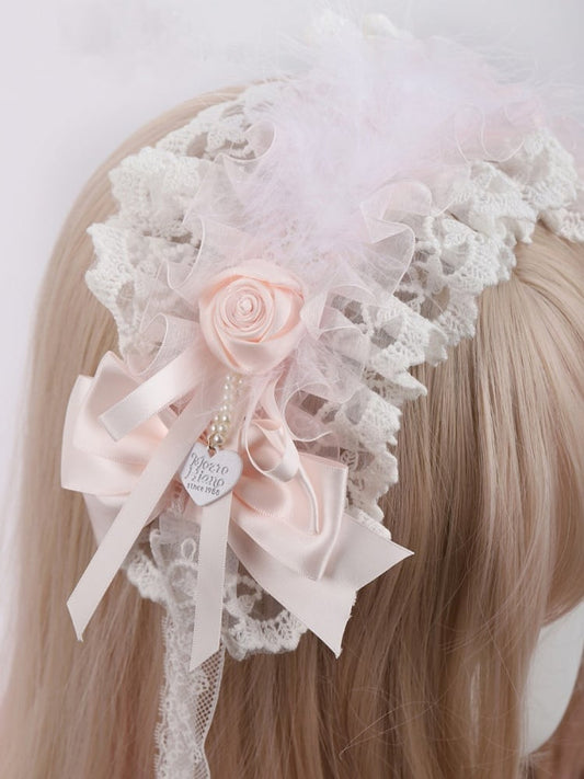 and Lace Hairband Lolita White Pink Sweet with Rose Decor Feather