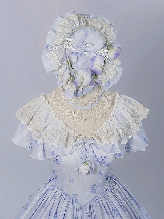 Lolita Beige Floral Design Blue Hat and