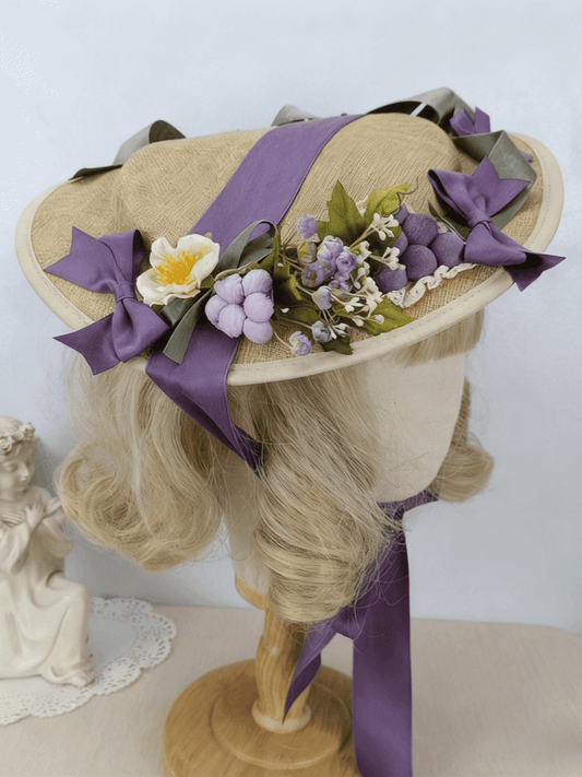 Purple Straw Ribbon Flat Lolita Deep Hat Cottagecore Decorated Grape