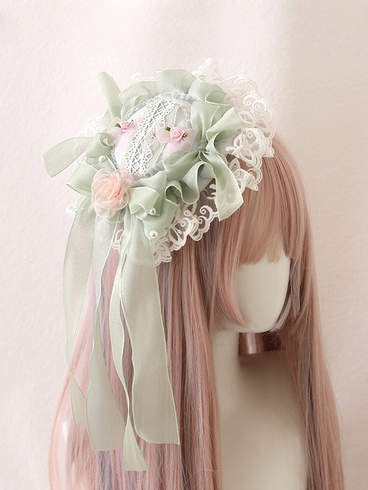 Hat Lolita Fresh Camellias Beads Mini With Pink Sweet Green Bowknots