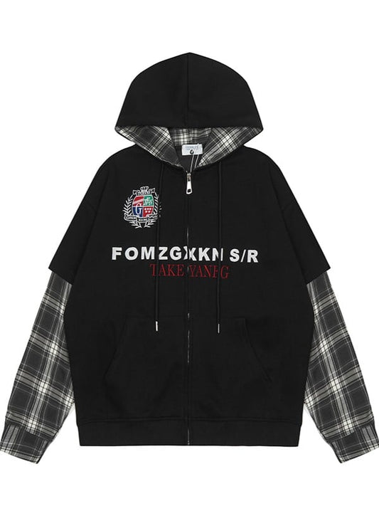 White Black Sleeve Plaid Blue Navy Patchwork Hoodie