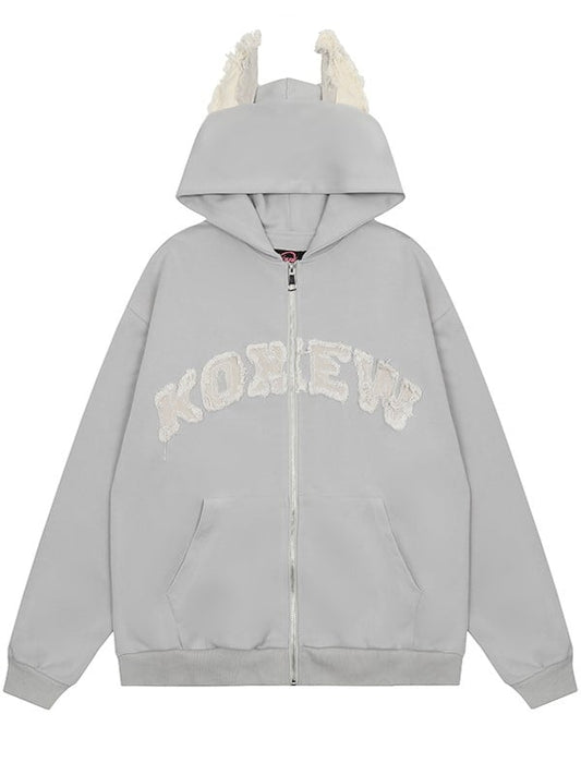 Bone Plushie Black/Gray Zip-up Hoodie with Kitty Ears Hood and