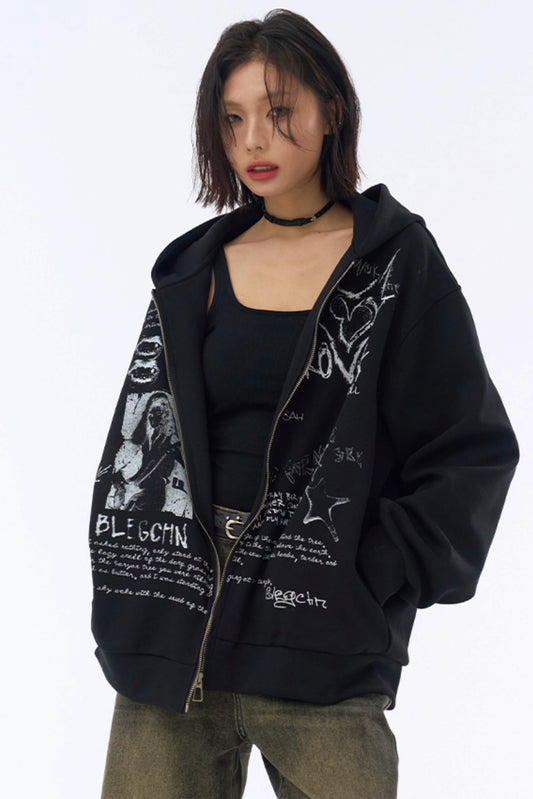 Autumn for Black Letter and Star Print Zip-up Hoodie