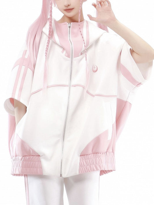 Blue and White Jirai Kei Techwear Straps Design Short Sleeves Zipper Hoodie