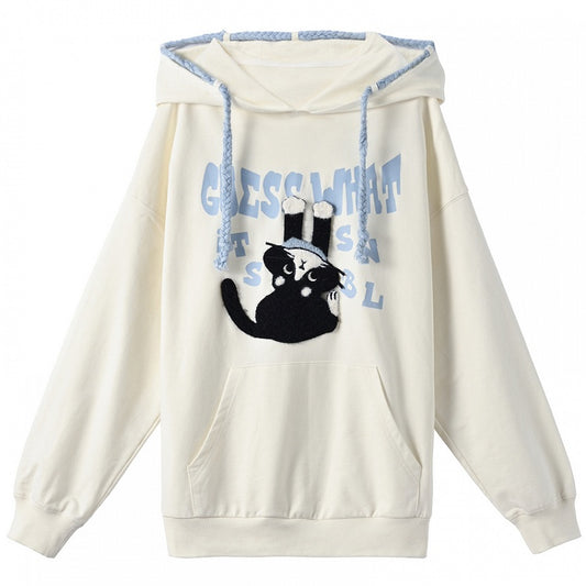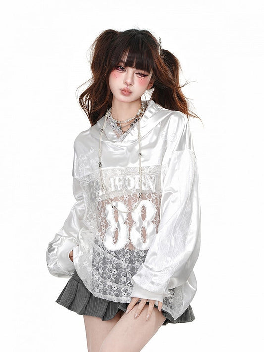 Black/White Bowknot Embroidery Contrast Lace Patches Loose Hoodie