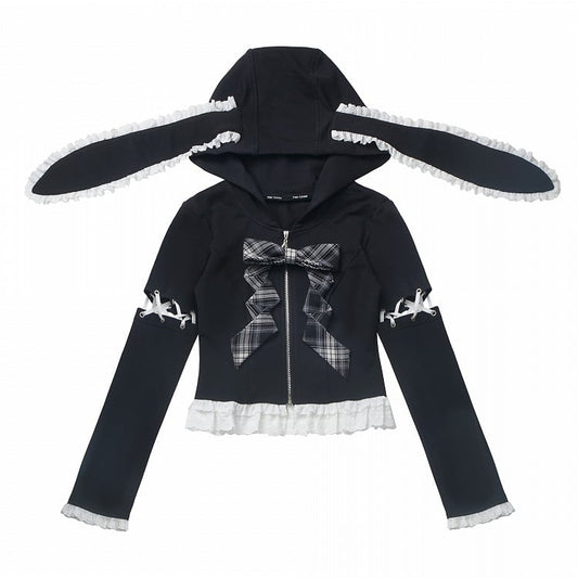 Lace-up Lace Trim Bunny Ears White/Black Design Hood Zip Closure Hoodie Sleeves Detachable