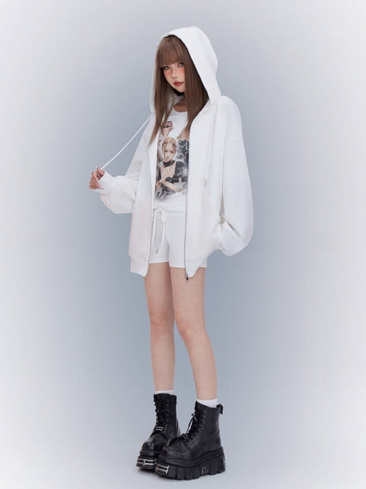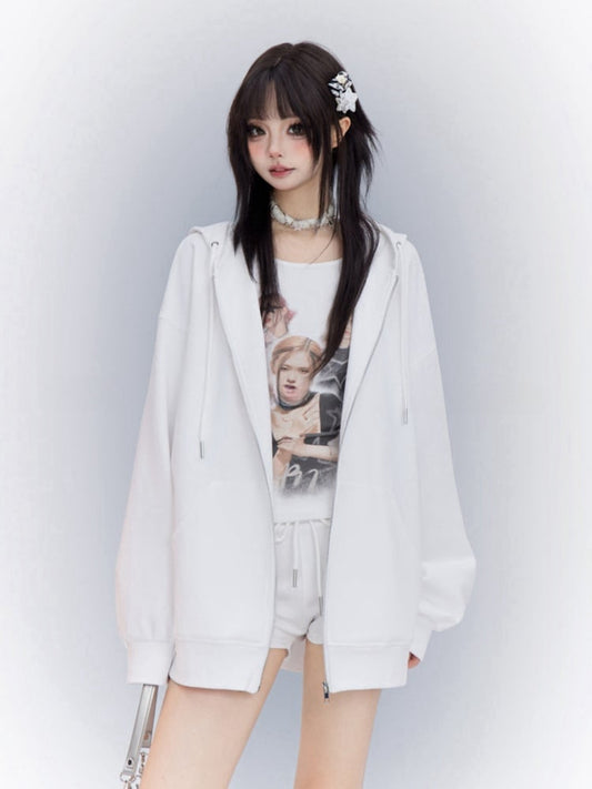 Sports Tank Three-pieces White Set-Zip Top+Shorts Closure Hoodie+Graphic