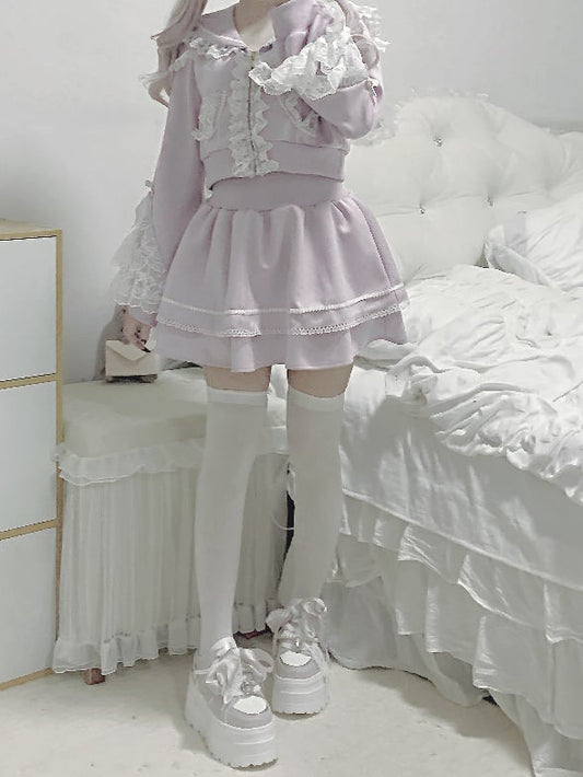 Light Lace Ruffled Hoodie+Lined Closure Jirai Kei Trim Skirt Zip Collar Purple Sports Set- Sailor
