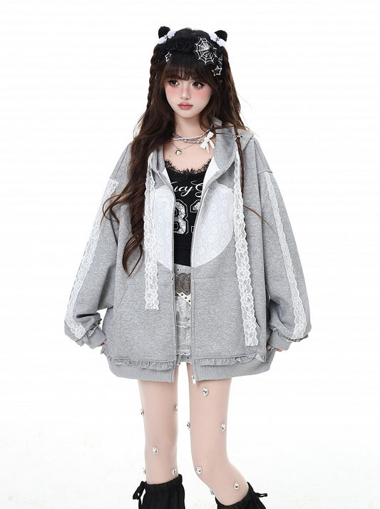 Light Gray Lace Applique Ruffled Trim Zip Closure Hoodie