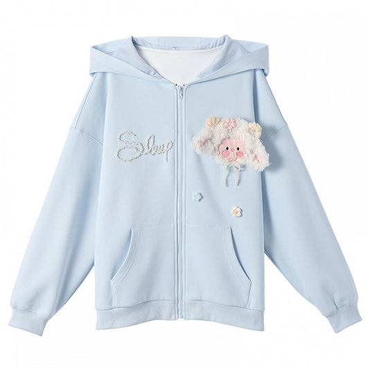 Yume Kawaii Blue Plush Lamb Knitted Floral Zip Closure Hoodie