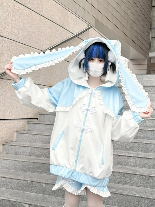 Tenshi Kaiwai Jirai Kei Blue Bunny Ear Hood Zip Closure Hoodie