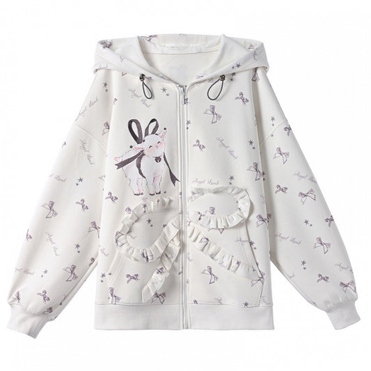 Ruffled Closure Hoodie Lamb Print White Zip Adorable Bowknot