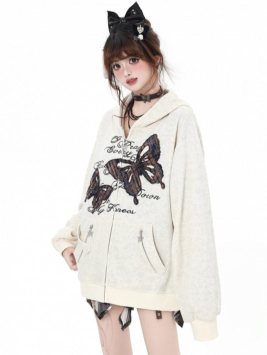 Brown Butterfly Appliques Spring Loose Zip Hoodie