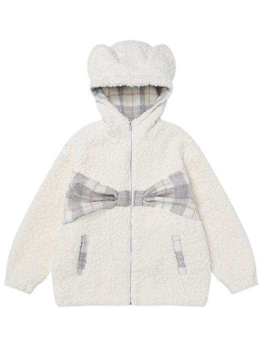 Milk White Plaid Bowknot Details Bears Ears Fleece Zip Hoodie