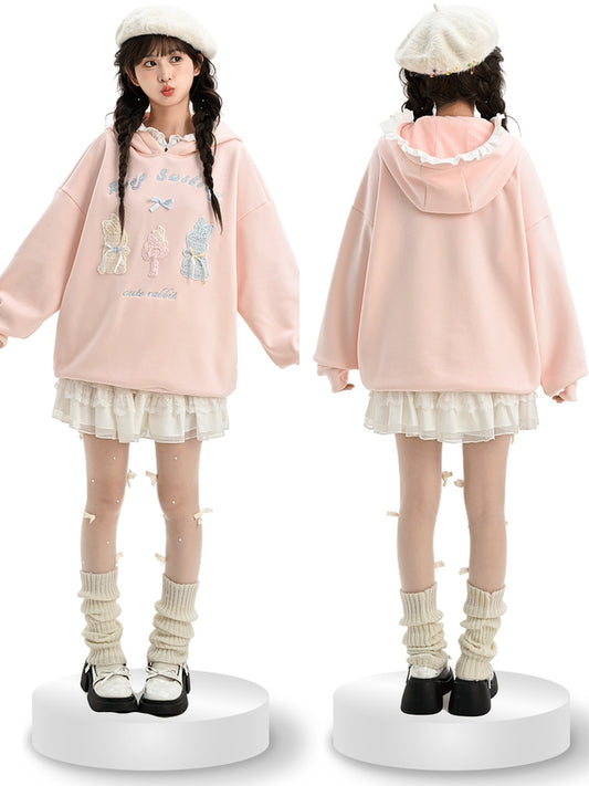 Pink Cute Crocheted Bunnies Details Fleece Lined Hoodie