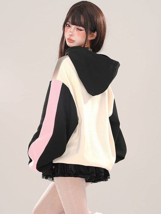 Black/Pink Letter Embroidery Colorblock Zip Hoodie
