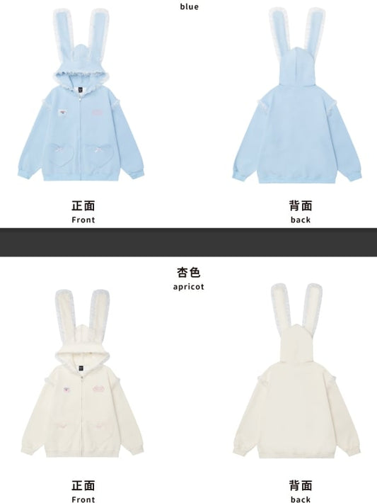 Light Blue/Apricot Bunny Ears Design Zip Hoodie with Lace Accents