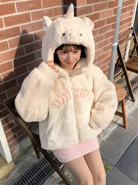 Beige Letters Pattern Unicorn Head Hood Fleece Zip Hoodie
