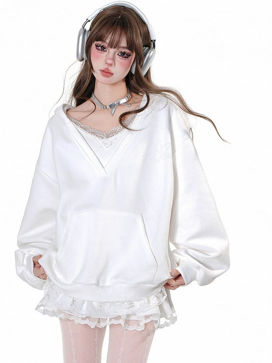 Grey/White Lace Trim V-neck Loose Hoodie Fake Two-piece