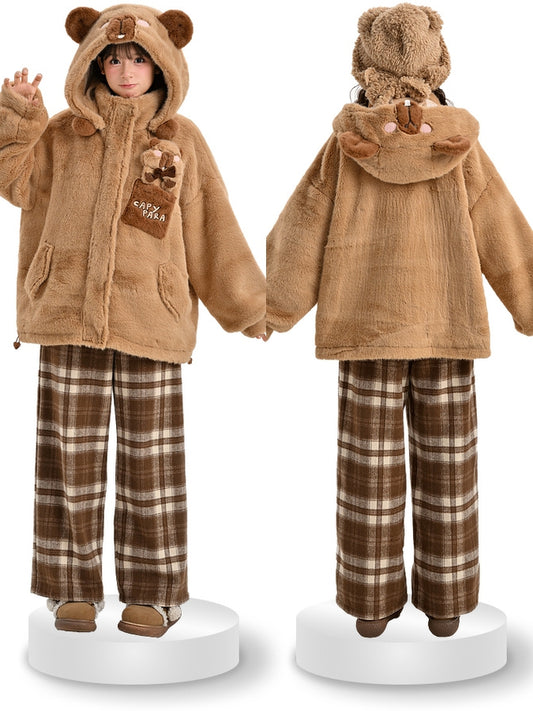 Cute Capybara Adorned Brown Plush Zip Hoodie