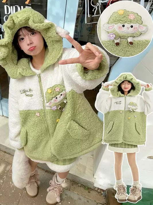Cute Lamb Applique White and Green Colorblock Design Fleece Zip Hoodie