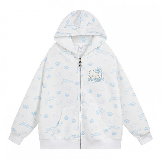White Cat Paws Allover Cat Ears Design Spring Zip Hoodie