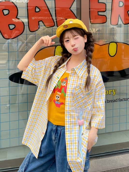 Placket Heart Short Star Button Sleeves Shirt Plaid Drawstring Green/Yellow