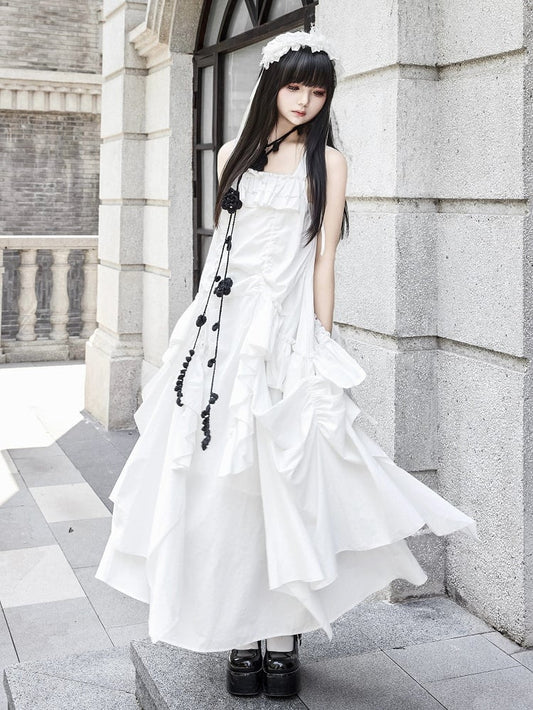 Dress Loose White Goth Ruffles Design Drawstring Cascading