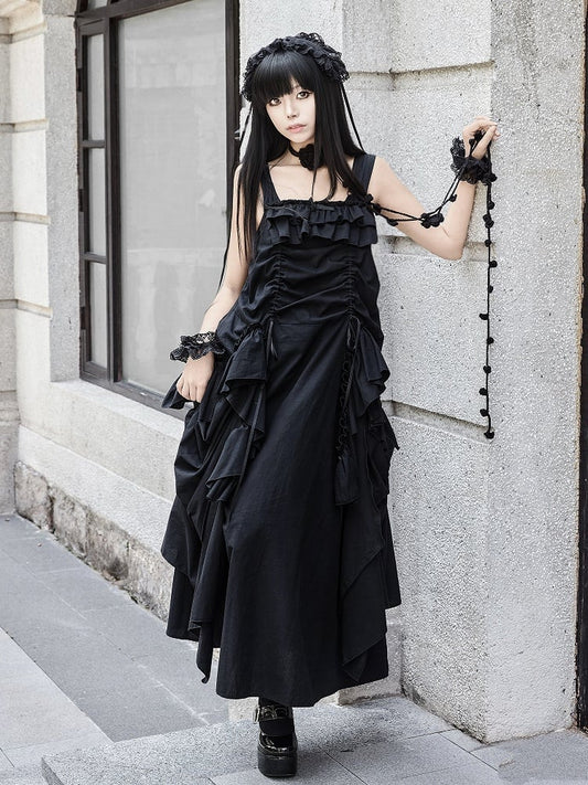 Dress Loose Design Black Ruffles Drawstring Goth Cascading