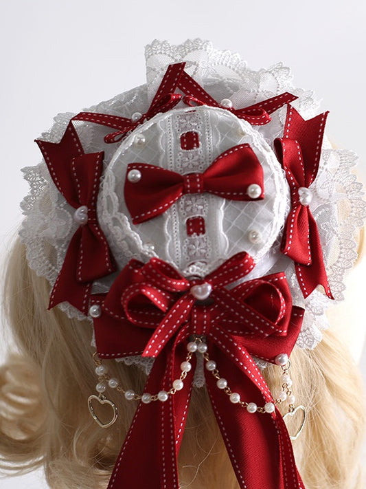 Bowknot Decorations Hat With Mini Heart-Shaped Red White Bead Charming Charms and Lace Lolita And