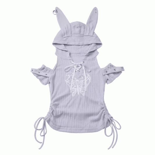 Blue Lace-up Hood T-Shirt Light Drawstring Waist Bunny Ear Design Neckline
