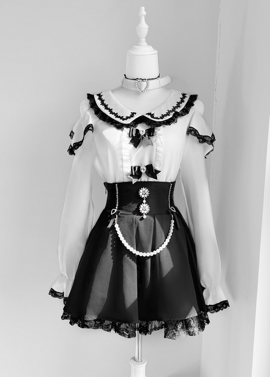 Detachable Trim with Design Lace Black Blouse Jirai Kei Peter Pan Collar Cutout Shoulder Contrast White Choker
