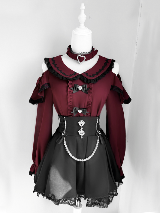 Jirai Kei Peter Pan Collar Cutout Shoulder Contrast Detachable Choker Trim Blouse Black with Wine Red Design Lace