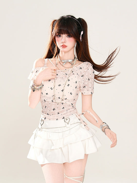 Asymmetrical Neckline Bow Print Drawstring Semi-sheer T-Shirt Pink Waist