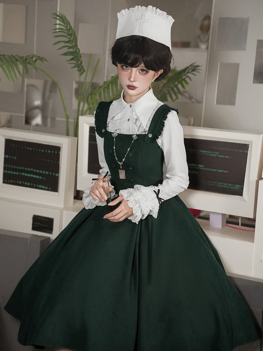 Ouji Lolita Vintage White Bishop Sleeve Shirt with Cascading Ruffle Placket & Detachable Lace Necklace